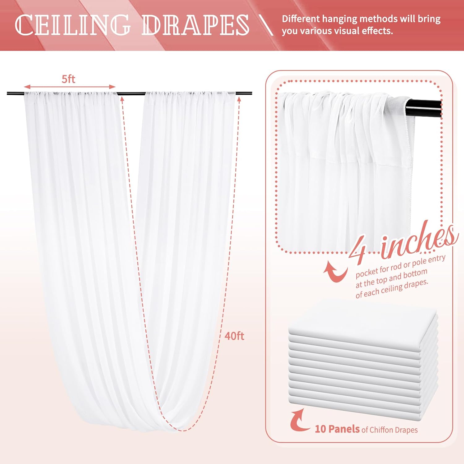 - 【Chiffon Fabric Curtain】The package will include 10 panels white wedding ceiling drapes (Not include stand !!!), each wedding extra long curtain measures 5 feet(60inch)wide x40 feet(480inch) long. Sufficient quantity can meet your needs. These arch draping are applicable for any indoor and outdoor occasion either for decorative or functional uses.