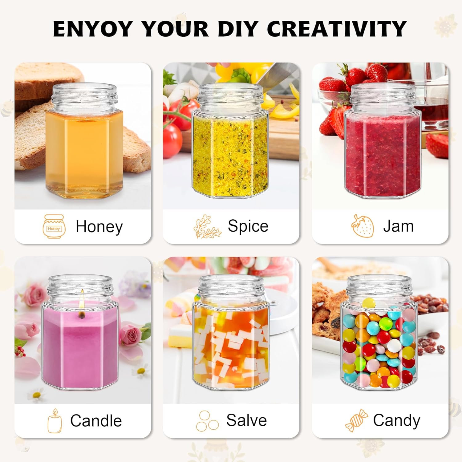 - 【Versatile mini honey jars with dippers】These 4 oz glass honey jars with lids are perfect for honey, spices, or candles. Their timeless design makes them ideal small honey jars for party favors, adding charm to any occasion.