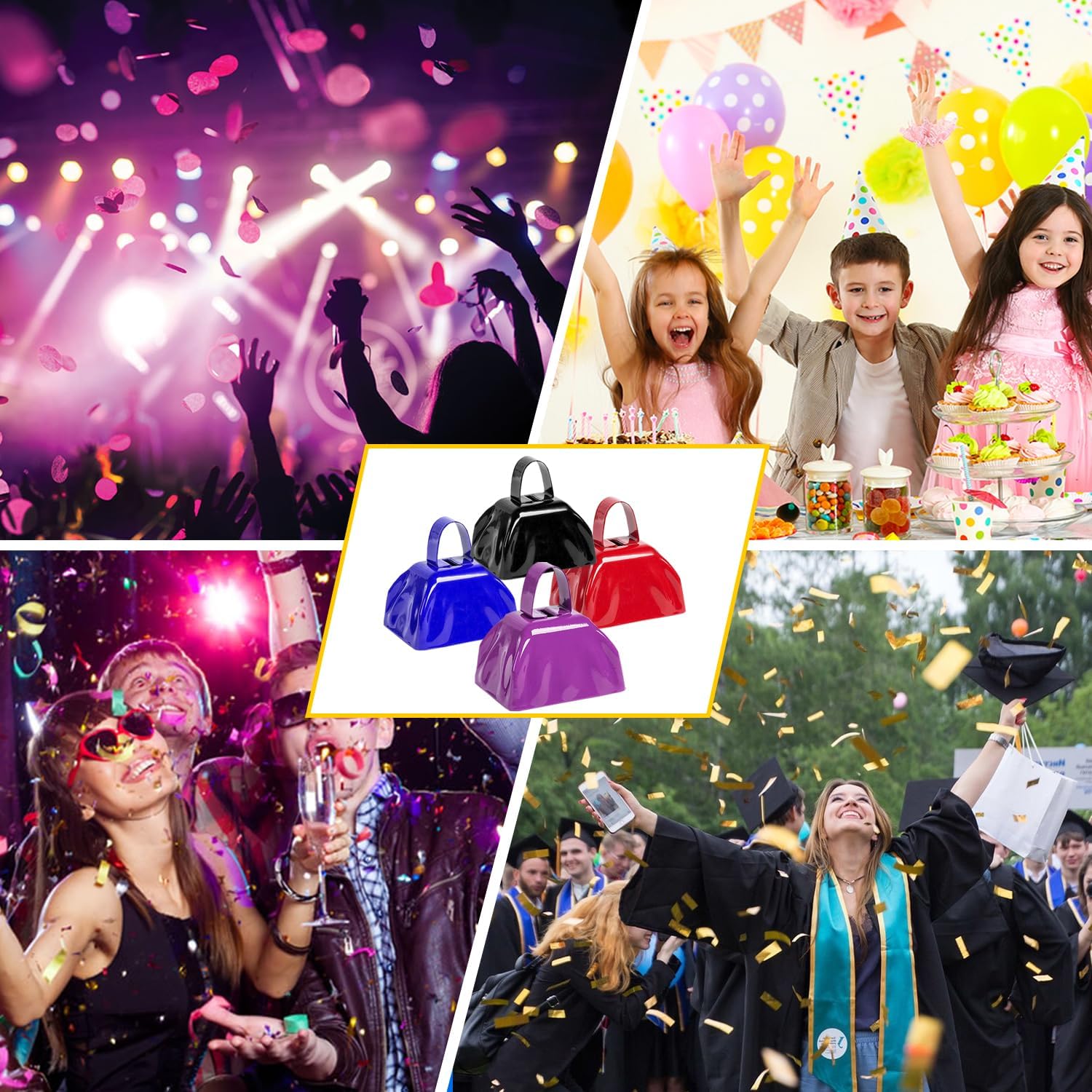 - PREMIUM QUALITY: Cheer on your team in style! This set includes four vibrant metal cowbells in blue, purple, black, and red. These sturdy, rust-resistant bells are built to withstand years of use at sporting events and celebrations.