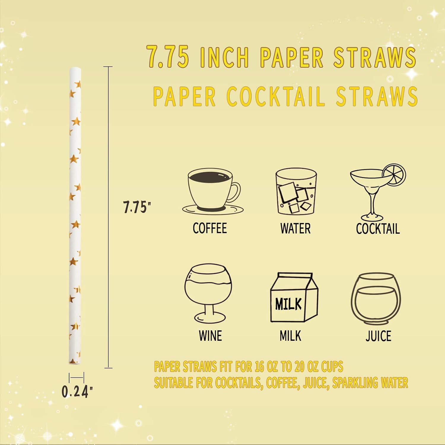 Paper Straws Disposable, Cocktail Metallic Gold Star Straws Drinking Biodegradable Straws for Holiday, Party, Wedding - 100 Count,7.75 Inch