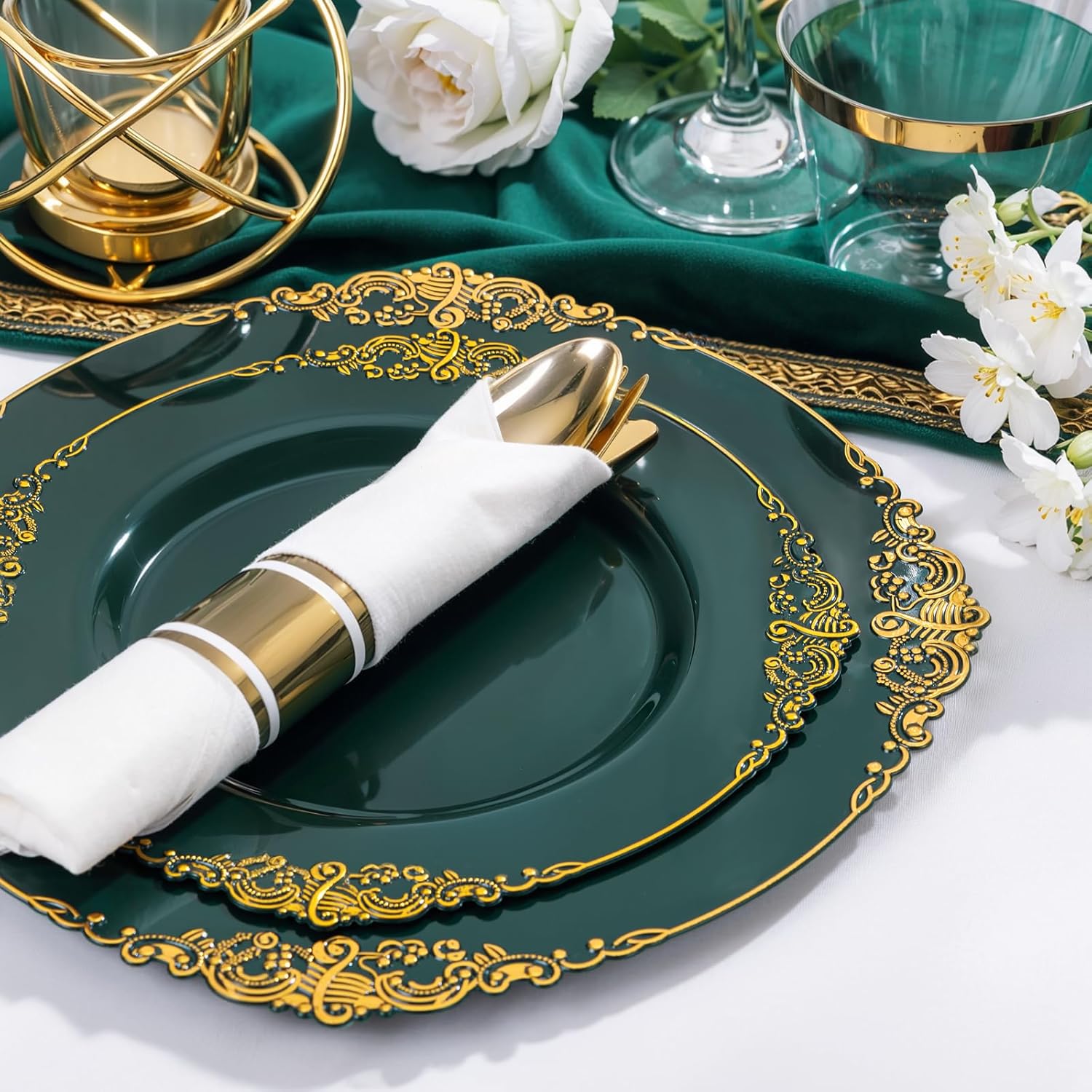 - Serves for 50 Guests - This green and gold plates set includes 50 dinner plates, 50 dessert plates, 50 cups, 50 napkins, and 150 pieces of silverware (50 knives, 50 forks, and 50 spoons), making it ideal for gatherings of up to 50 Guests