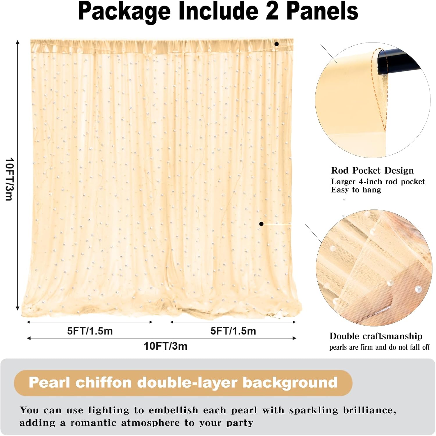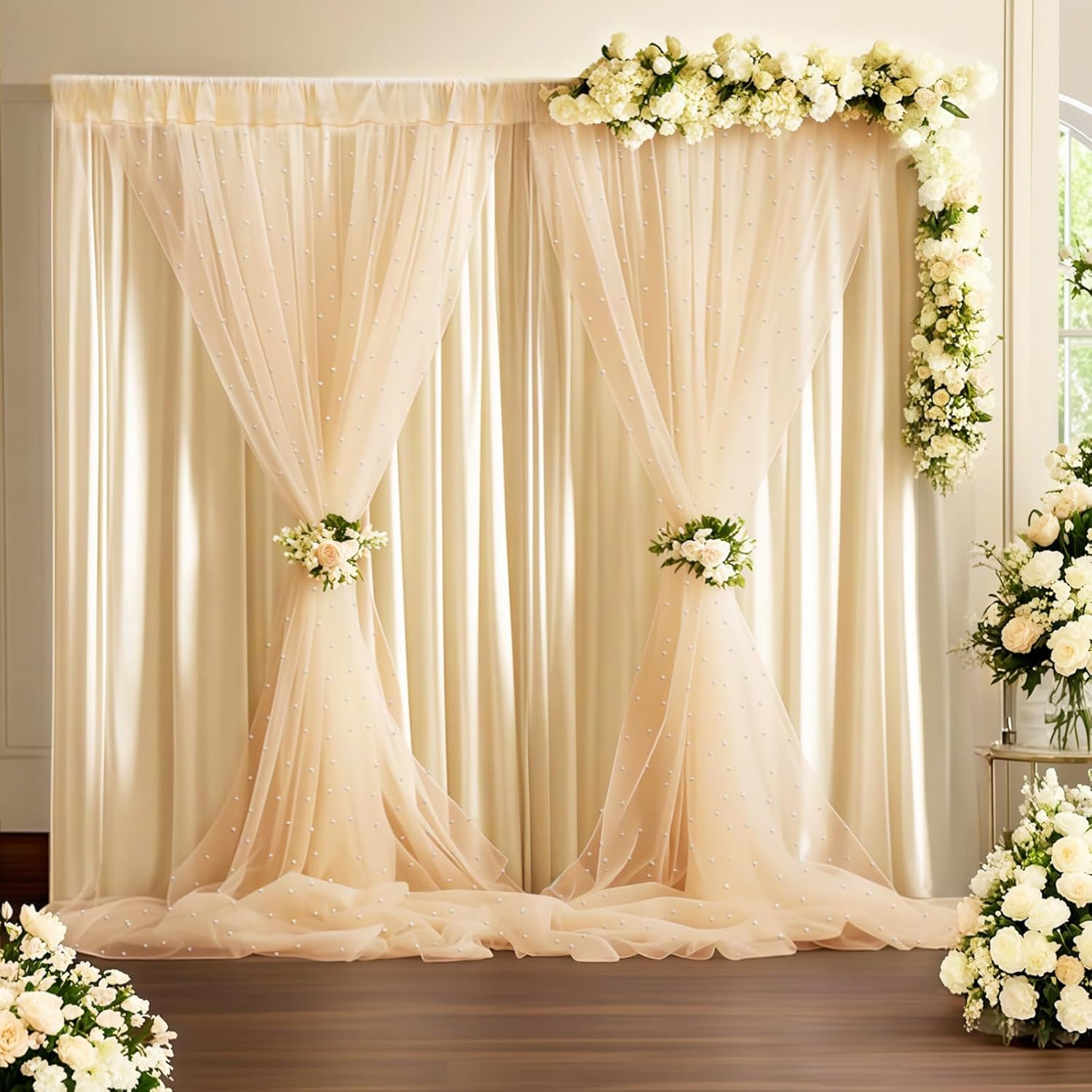 - Material: This is a set of double-layered backdrop curtains, which are composed of two layers: pearl tulle and beige lining. The pearl tulle exudes romance and beauty, while the white lining is designed to be opaque.