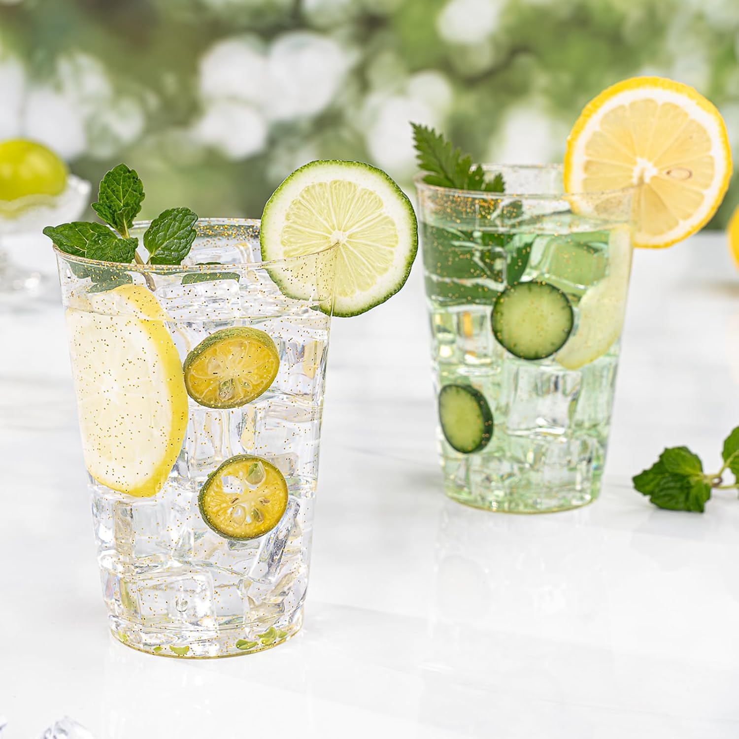 - Glamorous Design: These clear cups with glitter are a real treat! These gold plastic cups add a touch of glamour to any party or family gathering. Perfect for making your drinks look extra special