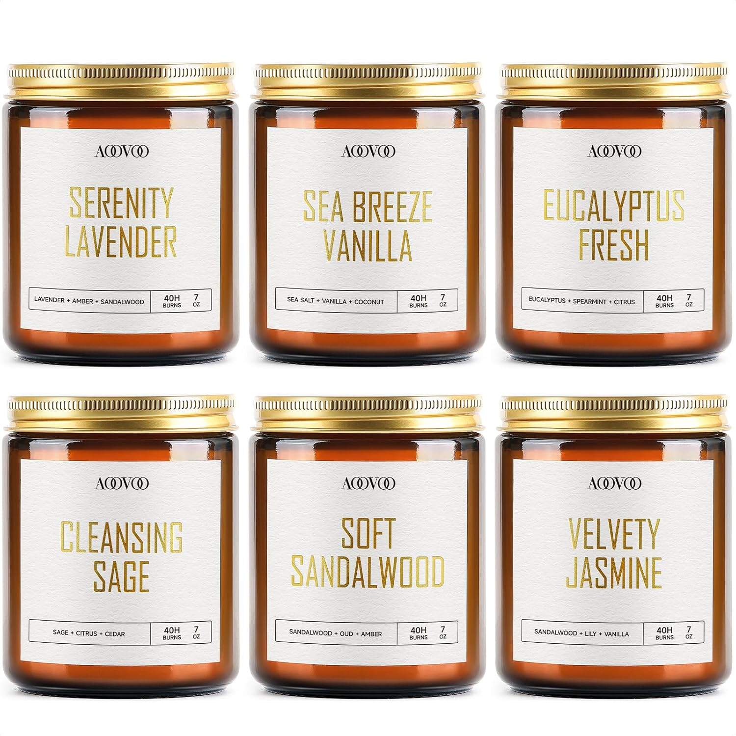AOOVOO Candles Set - 6PC Scented Candles, Soy Candle, Aromatherapy Candle, Soy Wax Candle, Candle for Home Scented, Lavender/Vanilla/Eucalyptus/Sage/Jasmine/Sandalwood