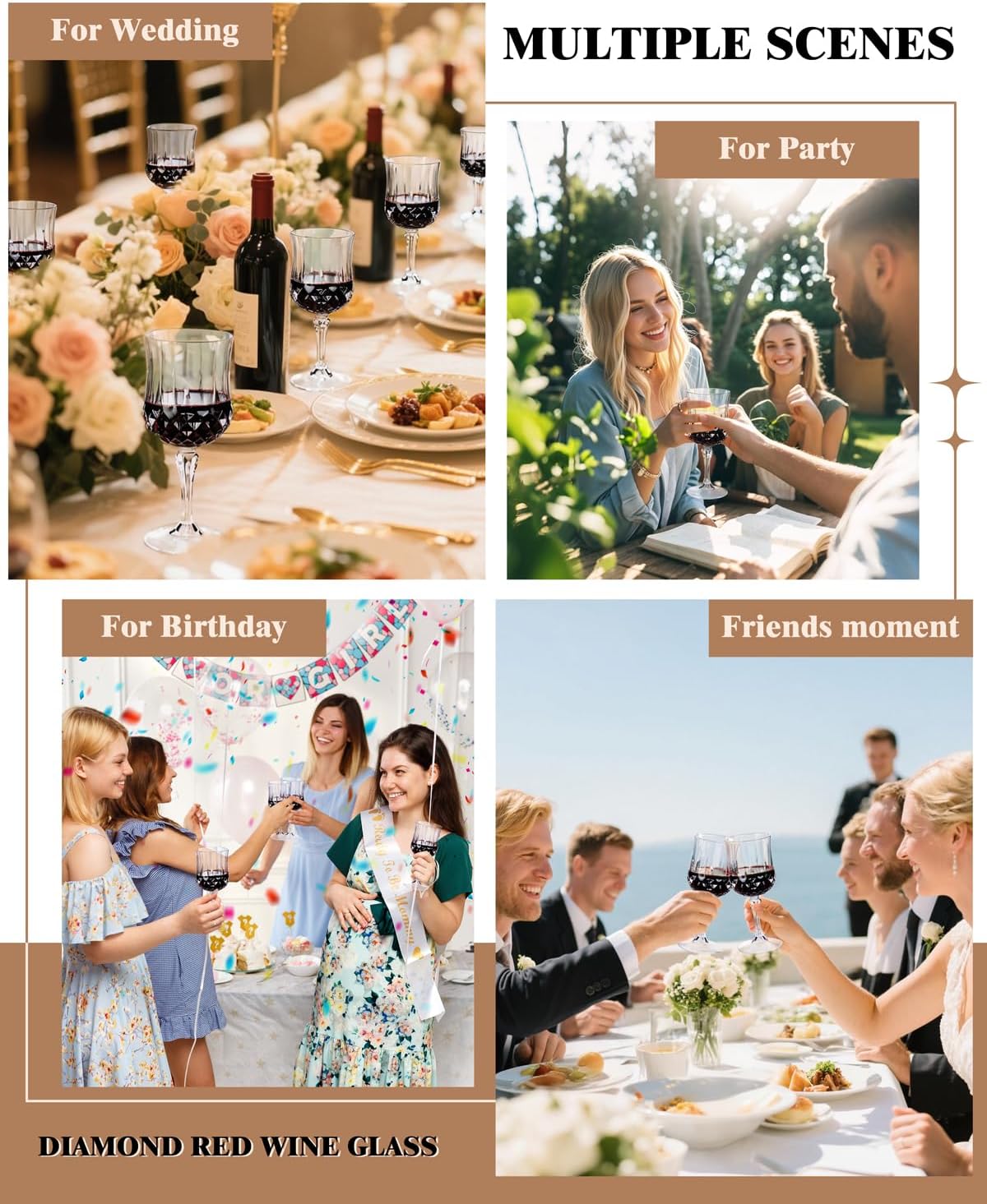 - Retro diamond-shaped pattern design: Imitating real crystal, plastic wine glasses have the charm of a vintage wine glass. Plastic wine glasses disposable’s retro design enriches the modern and classic dining table setting with an elegant atmosphere.