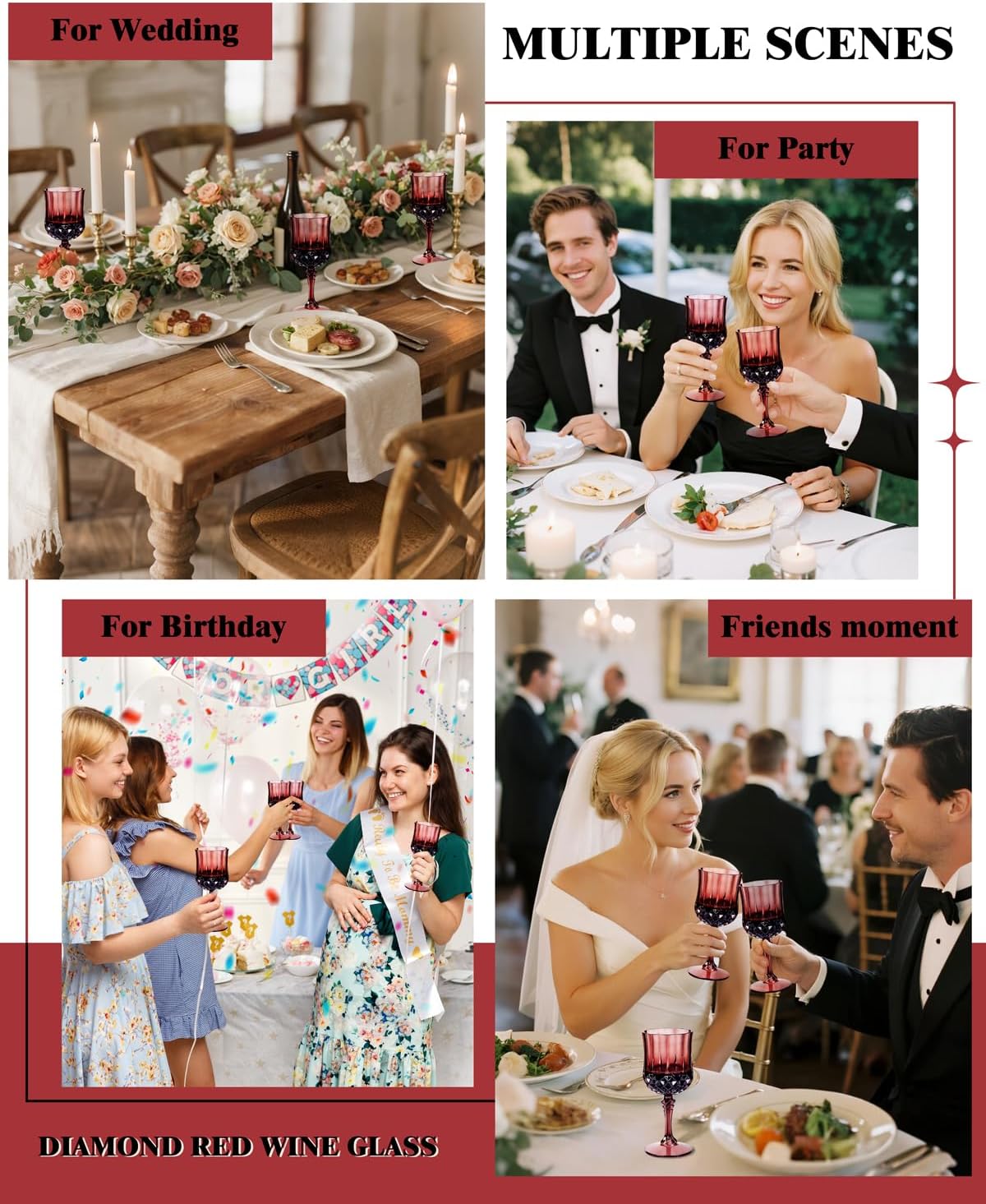 - Multi-occasion use: These 7 Oz disposable burgundy wine glasses can be used in various occasions, such as entertainment events, weddings, bars, or casual gatherings. These plastic wine cups blend seamlessly with tableware. Plastic goblet glasses can not only serve as table decorations but also hold wine, beer, cocktails, juice, and so on.