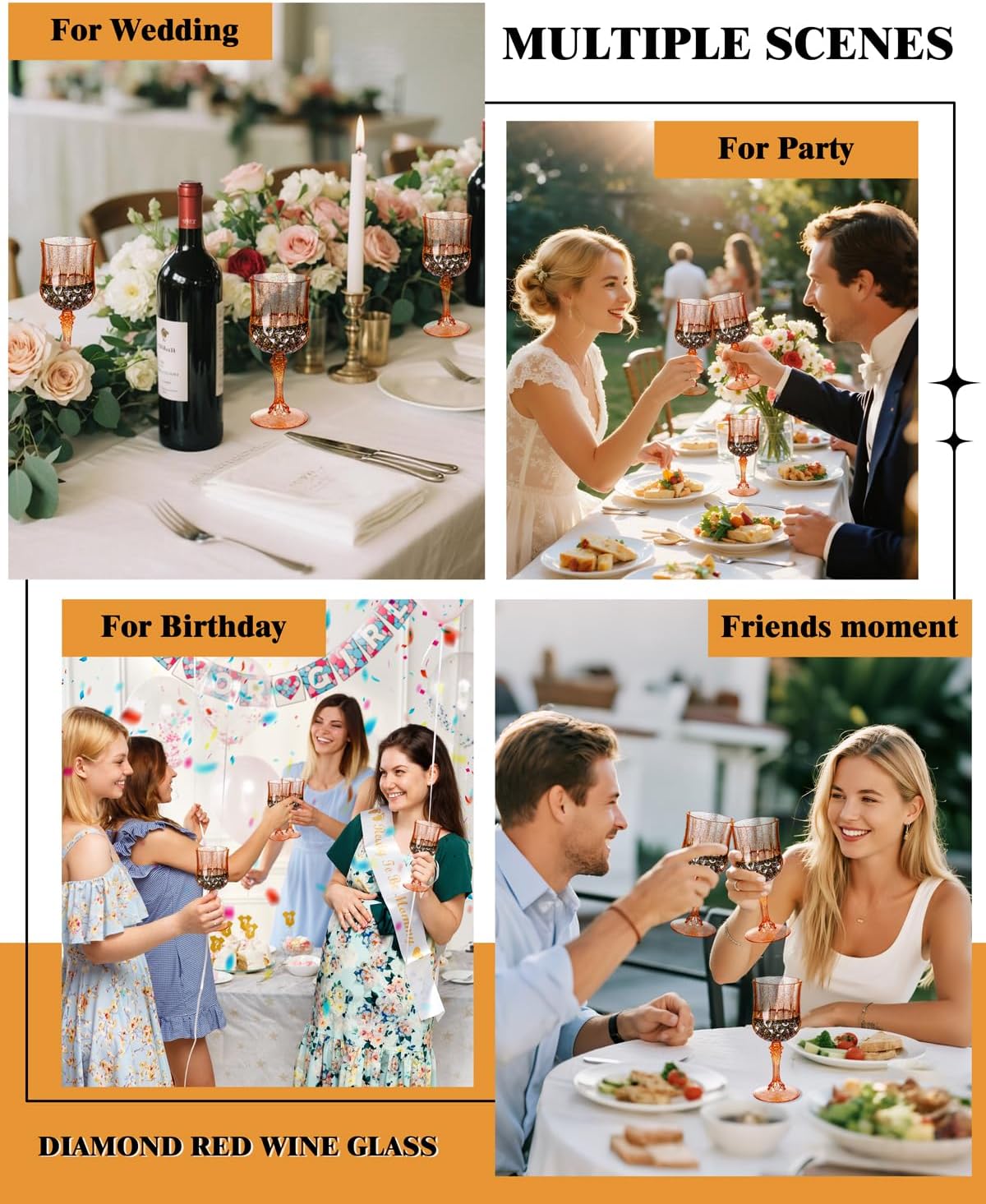 - Multi-occasion use: These 7 Oz disposable wine glasses can be used in various occasions, such as entertainment events, weddings, bars, or casual gatherings. These plastic rose gold with glitter wine cups blend seamlessly with tableware. Plastic goblet glasses can not only serve as table decorations but also hold wine, beer, cocktails, juice, and so on