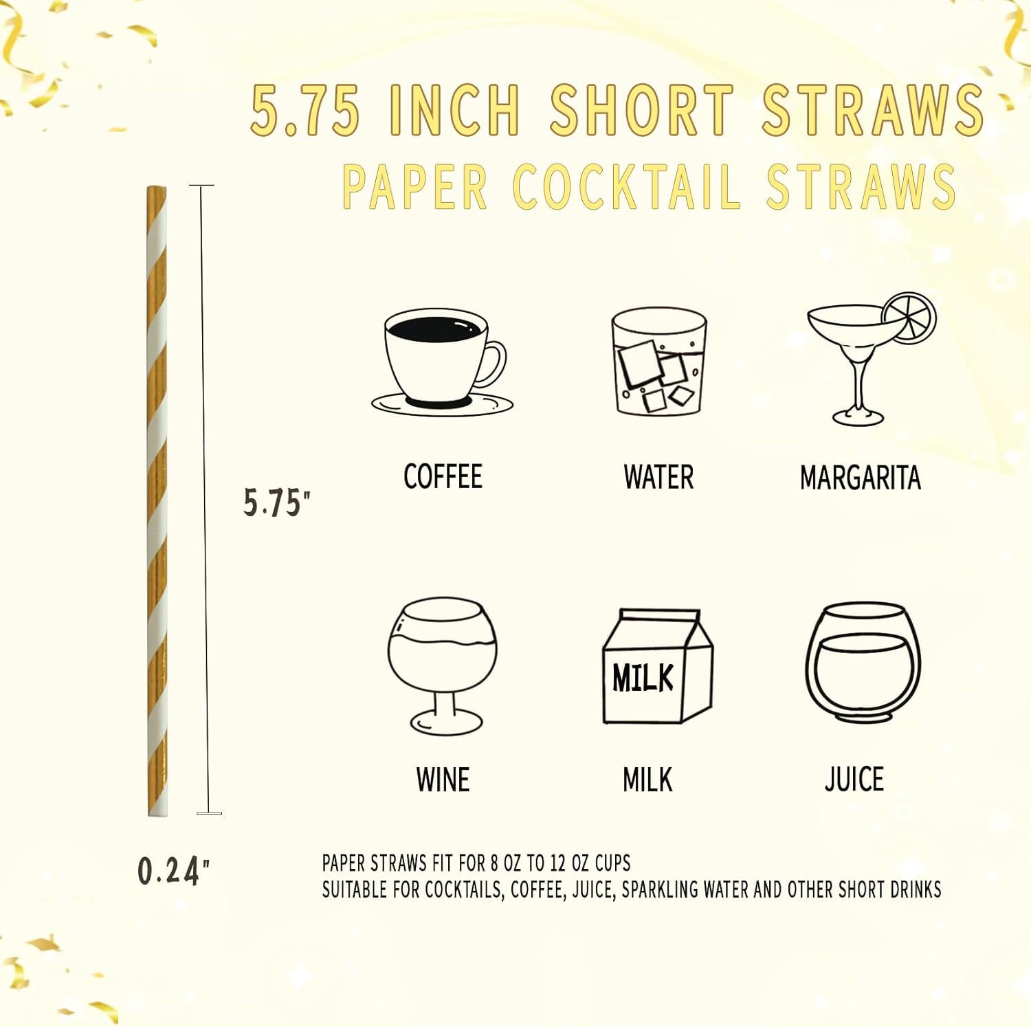 Gold White Stripe Paper Straws - 5.75 Inch Short Paper Drinking Straws, for Birthday, Wedding, Bridal, Party, Bars, Restaurants, Drinks - 500 Counts