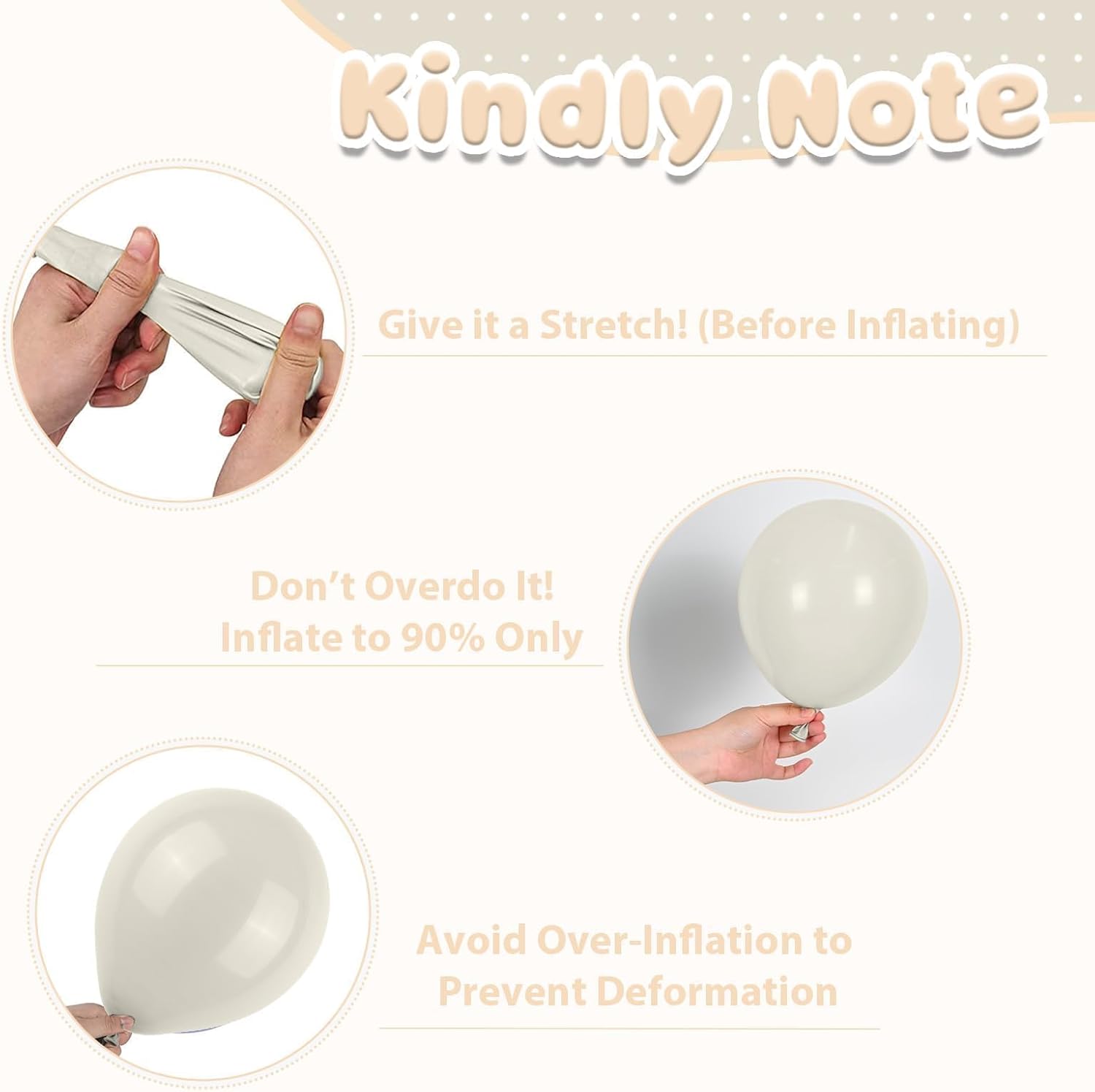- Premium Quality Balloons: These sand white and white balloons are crafted from premium latex, offering excellent elasticity and durability. they can be filled with either helium or air, and when tied securely, they'll stay inflated for several days! With their vibrant colors, they are the ideal choice for adding a fun, colorful touch to any party or event.
