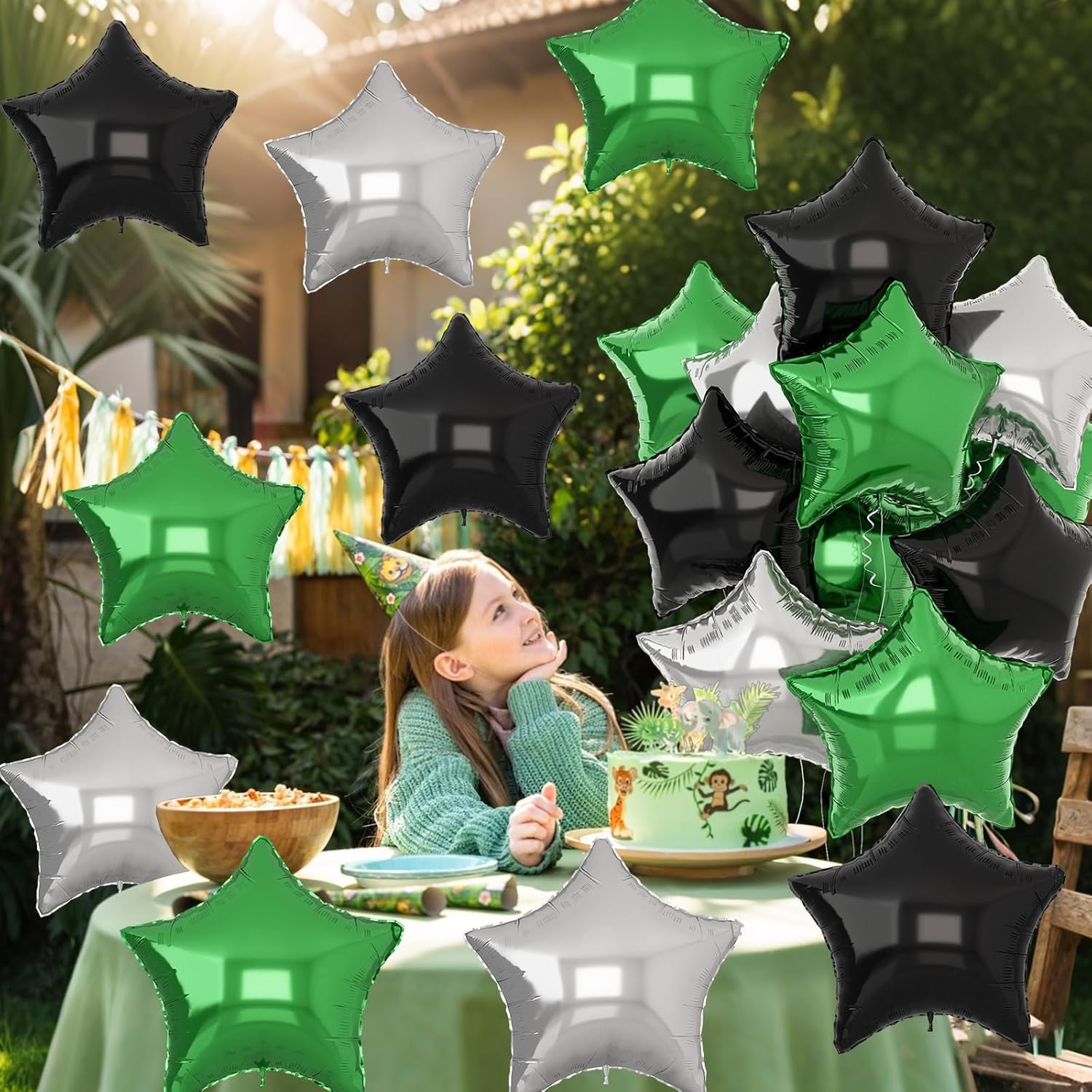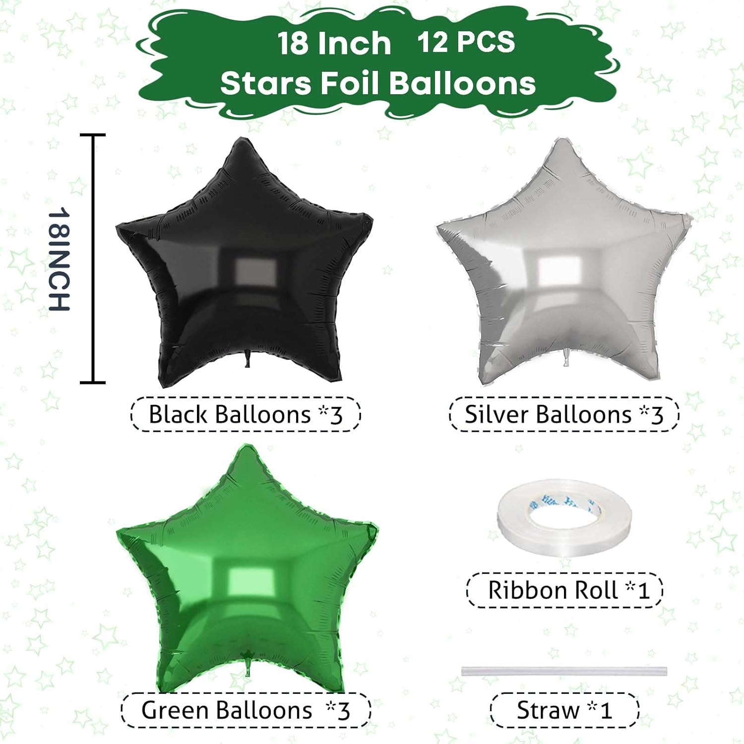 - Black Green and Silver Stars Party Balloons: This 12Pcs green black foil star balloons set designed with Giant 18 inch pentagram foil balloons, includes green star mylar balloons, black star mylar balloons and silver star mylar balloons, each balloons set comes with a straw and ribbon