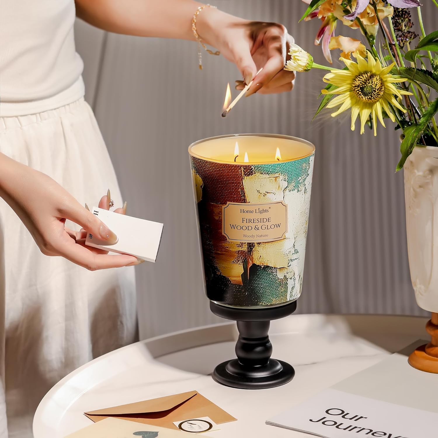 HomeLights 3-Wick Candles for Home Scented - 34oz Soy Wax Blend Candle Long-Lasting Fragrance, Industrial Chic Home Decor and Housewarming Gifts, Fireside Wood & Glow