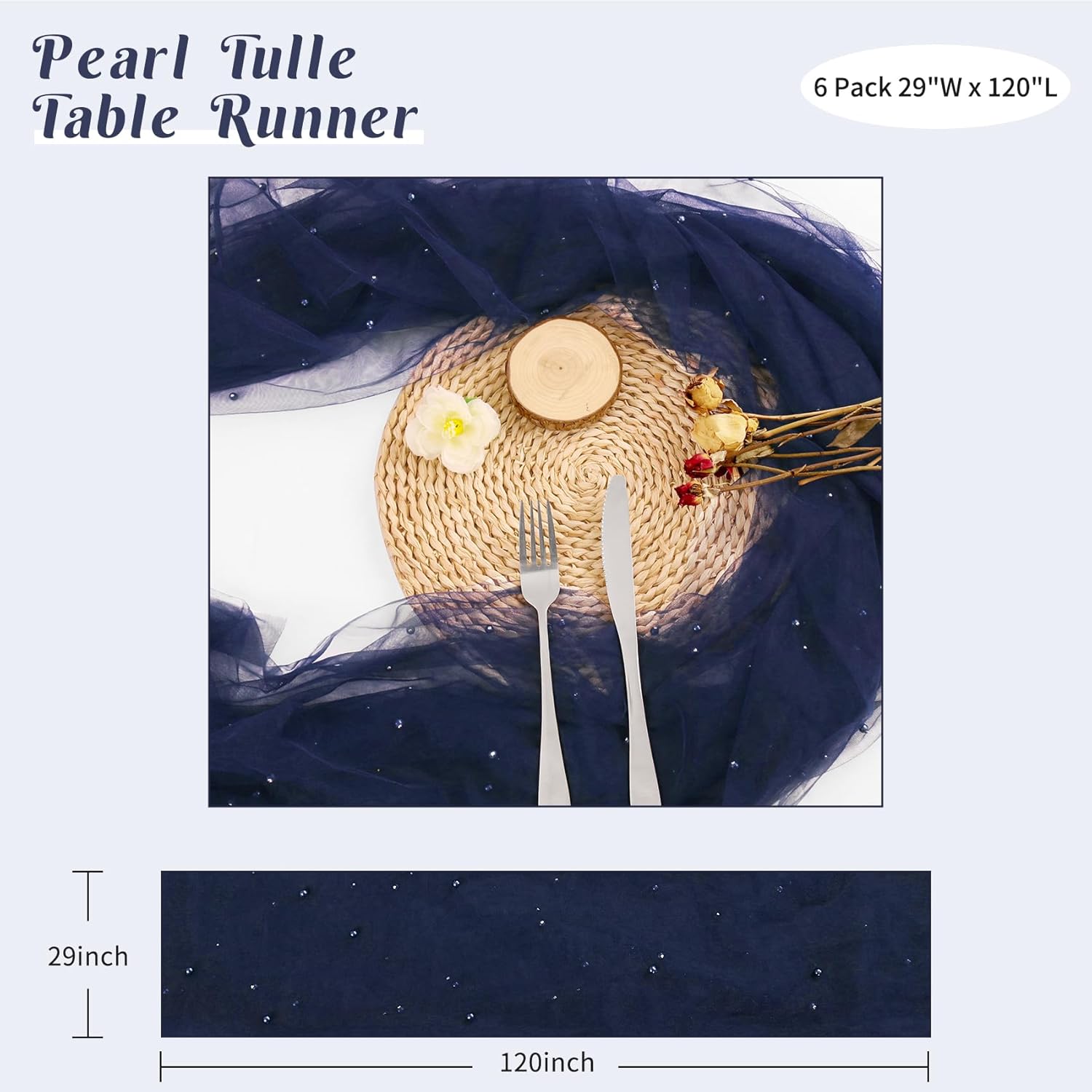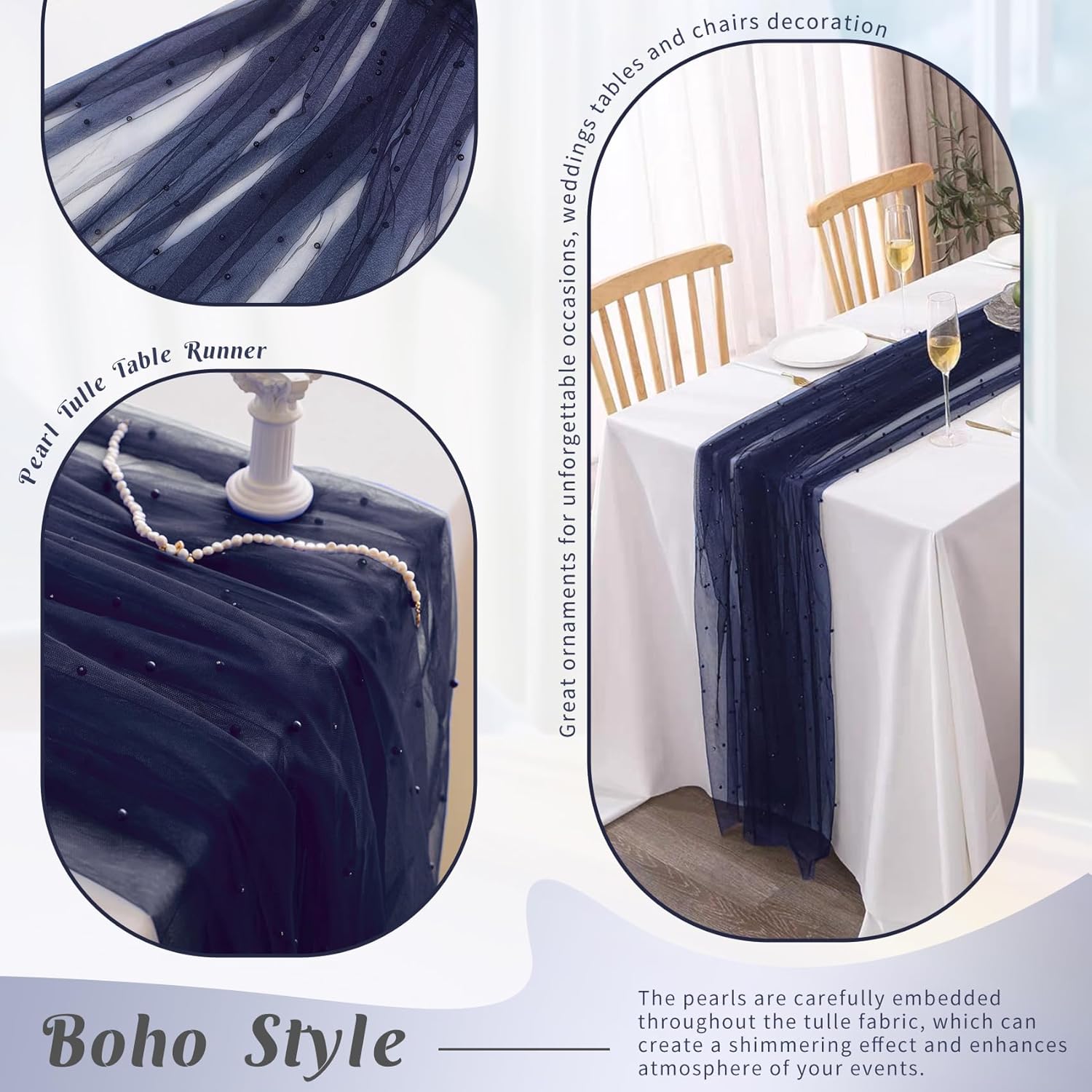 - 【Package Include】 You will receive 6 pieces of 29 x 120 inches pearl tulle table runners, the quantity is sufficient for your daily use and replacement needs, it's long enough to fit different size tables and chairs, These tulle table runner with pearls are skin-friendly. There are lots of different colors for you to choose. Perfect to decorate your tables.