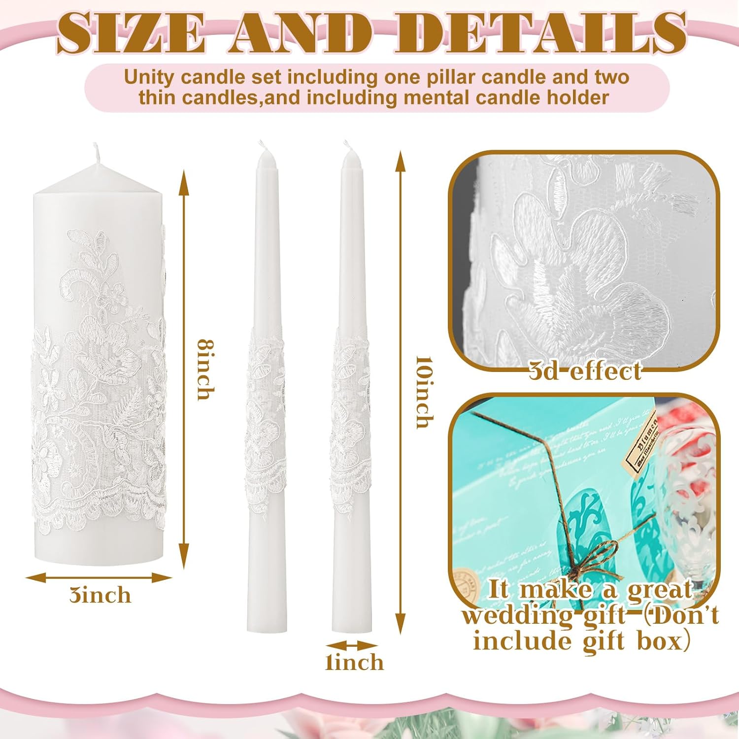 - Nice Gifts: the unity candles and holders are practical and decorative, will be an beautiful gift for your friends, family members, girlfriend, colleagues and other people, suitable for weddings, anniversaries, birthday, home decor, dinner parties, festivals, formal events, weddings, to add luster to these occasions