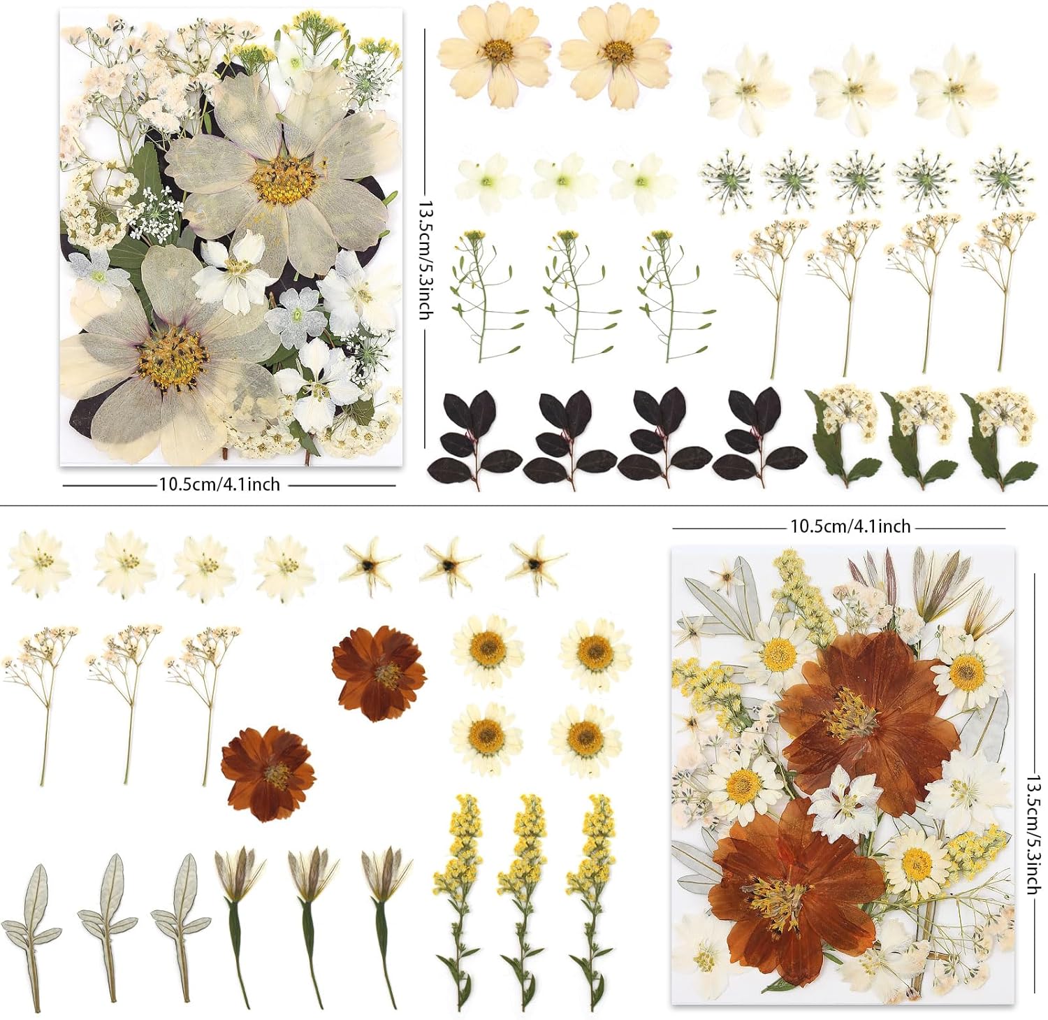 - Vintage-Toned Dried Flowers: 100P dried pressed flowers in sepia yellows, muted burgundies & weathered greens. Unique dancing flowers & silver-backed ferns bring timeless vintage charm to resin art, retro scrapbooking & bohemian DIY