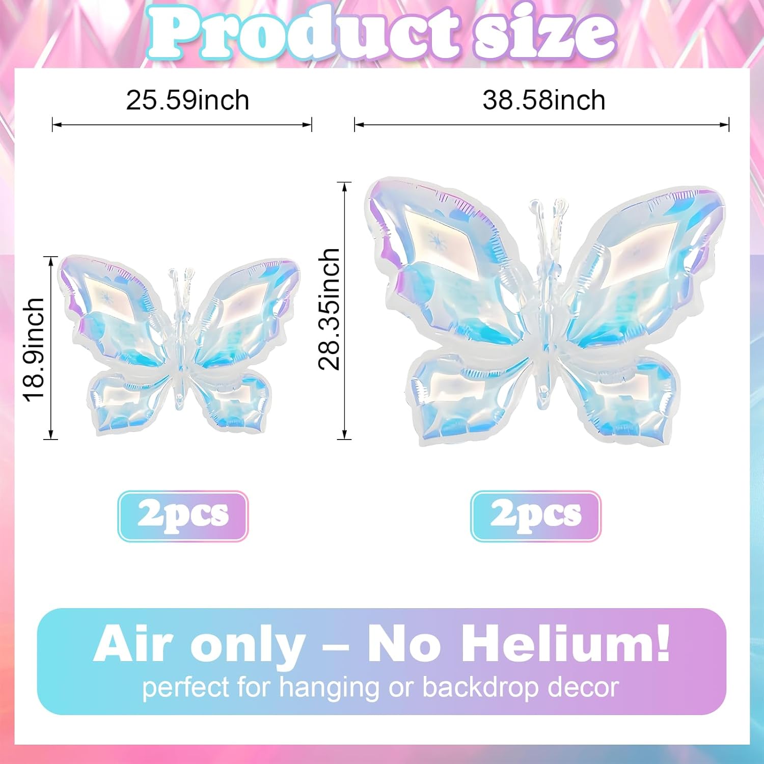 - Iridescent Foil Balloons: Elevate your celebration with our set of 2pcs 25.59*18.9in and 2pcs 38.59*28.35in rainbow butterfly foil balloons. Accompanied by a ribbon, these balloons are ideal for creating a festive and loving atmosphere at any special event.