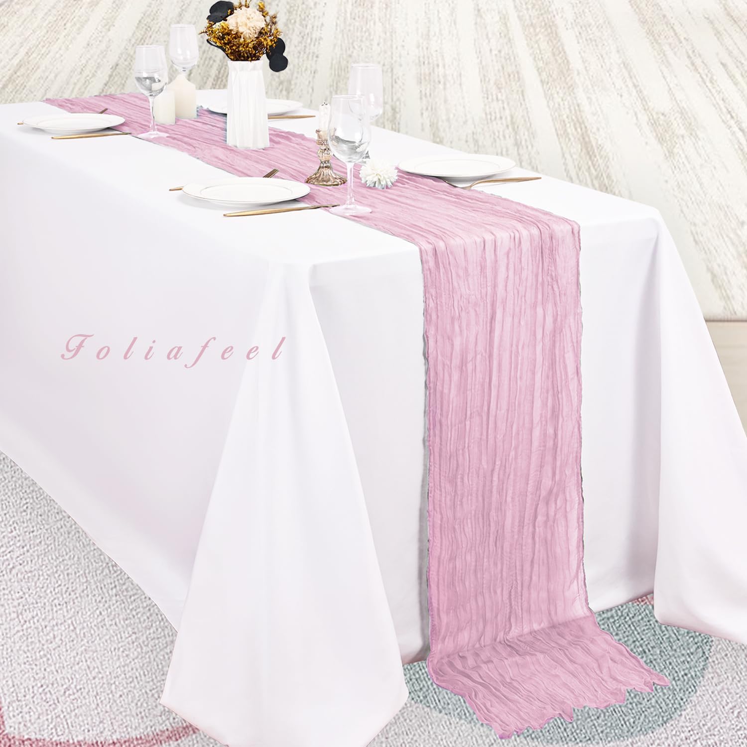- Elegant Design: This cheese cloth runner is a perfect decorative element for dining tables and parties. Its pleated design makes it very elegant and romantic, flowing naturally on the table like water, making the dining table for weddings and parties look very beautiful. It can be paired with flowers and candlesticks, or tied with a bow to create various romantic feelings.