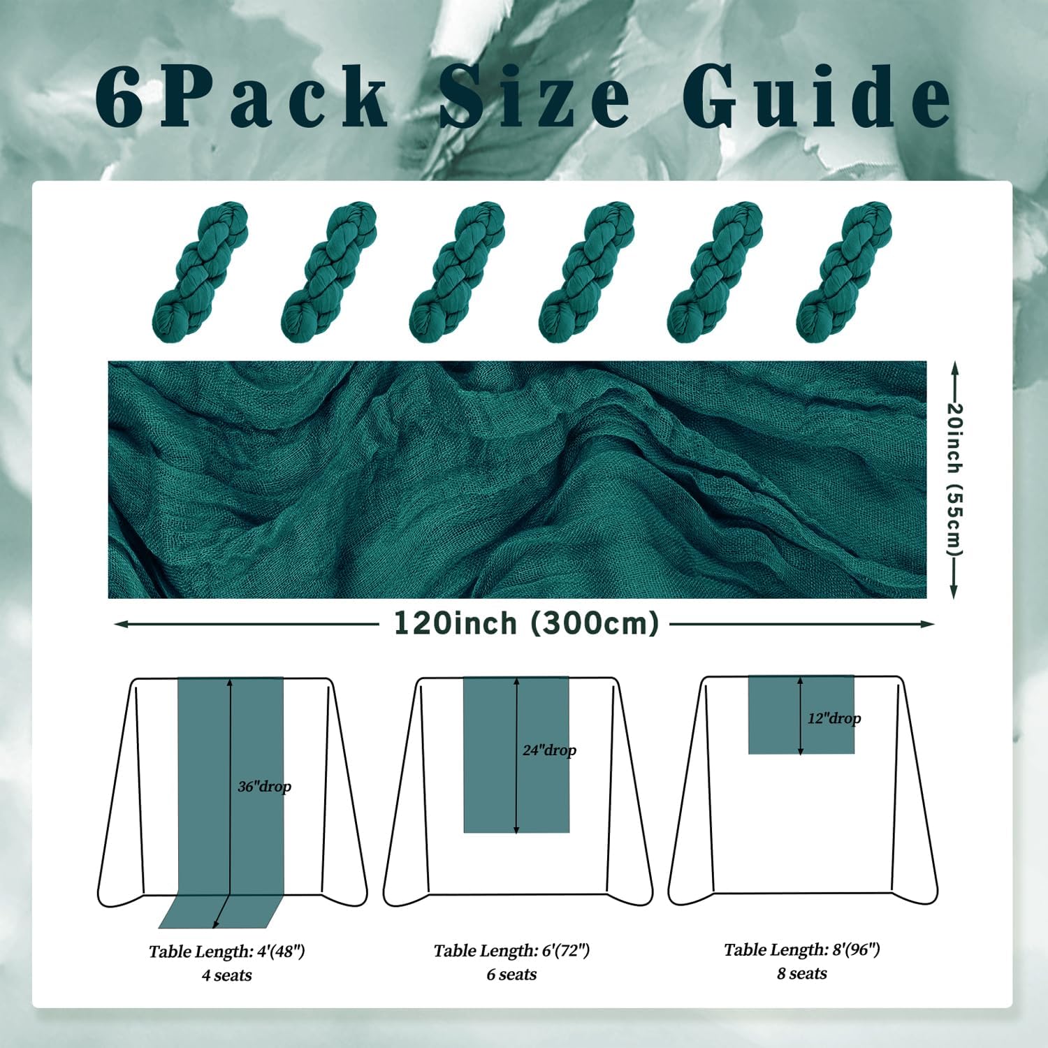 - Cheesecloth Table Runner Size: You will receive 6 teal cheesecloth tablerunner, each measuring 20 x 120 inches. The quantity is sufficient for you to decorate various romantic occasions. It can decorate most shaped tables, such as rectangular tables, round tables, and cocktail tables. It is long enough to decorate a large table and be placed perfectly and elegantly on the tabletop, adding a romantic atmosphere to your occasion.