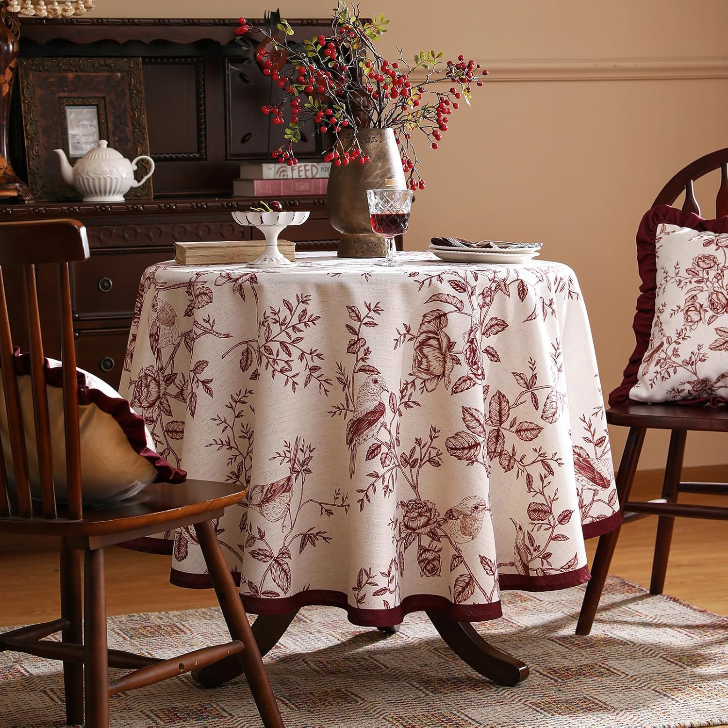 ISAENNE Designer Vintage Linen Round Tablecloth,Red Floral Pattern Linen Stain Resistant Table Cloth,Decor Tablecloths for Dining Thanksgiving Kitchen Christmas,Diameter 67"-Harmony