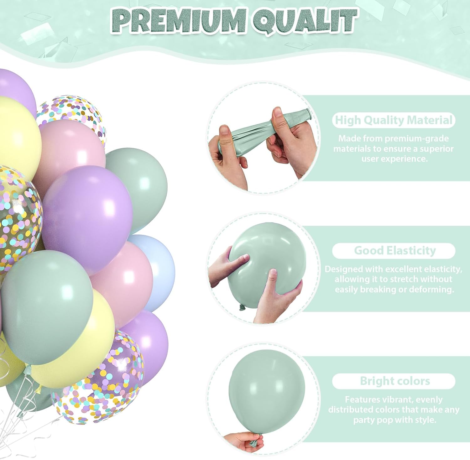 - All-in-One Set: This pastel balloons kit includes 11pcs macaron green balloons, 11pcs macaron pink balloons, 11pcs macaron teal blue balloons, 10pcs macaron purple balloons, 10pcs macaron yellow balloons, 7pcs colorful confetti balloons, and 1pc silver ribbon. Whether it’s a birthday bash or bridal shower, the thoughtful color combo, suitable for adding a fun, modern touch to any celebration.