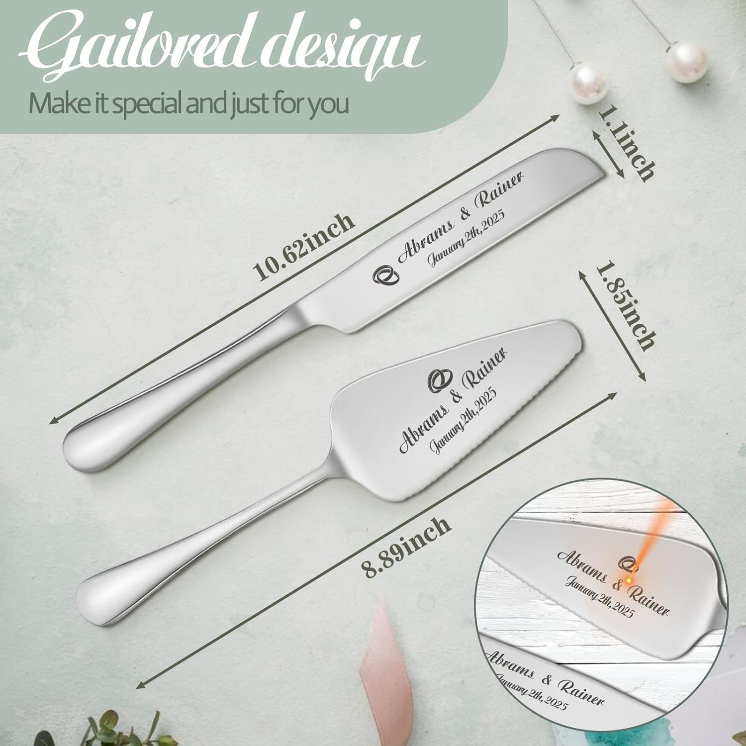 - Personalized Wedding Cake Cutting Set : Personalize the cake knife and server with names, dates,transforming them into a one-of-a-kind keepsake. The precision engraving turning your cake-cutting ceremony into a moment to cherish for a lifetime