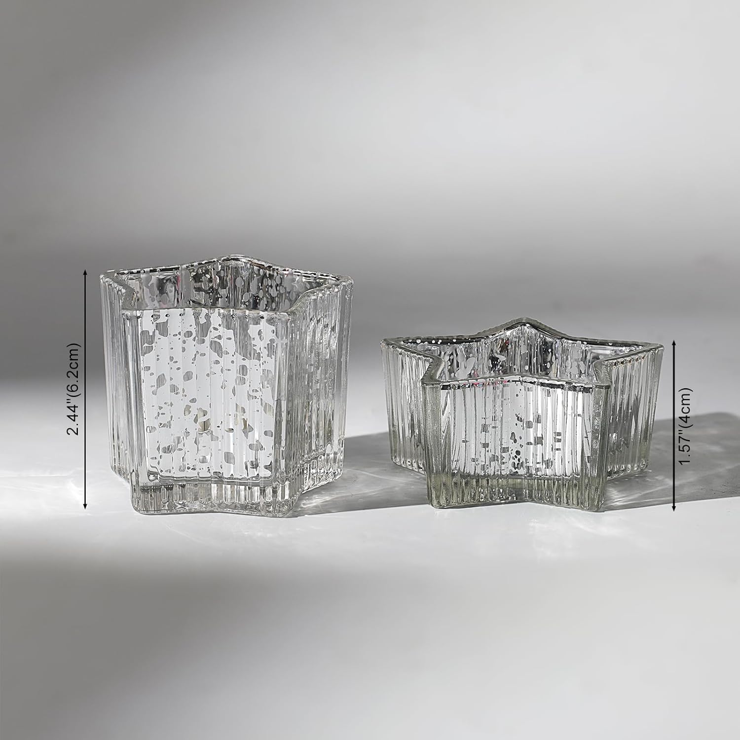 Letine 10pcs Silver Ribbed Star Candle Cups - Assorted Height Tea Light Holders, Votive Candle Holders forWedding, Fall Table Centerpiece, Mercury Glass Lucky Star Jar Decor(Tall 2.44", Short 1.57")