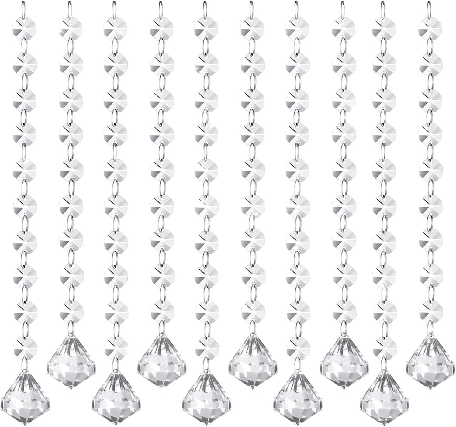 - 【Product Include】You will receive 10 pcs of crystal garland strands. The clear octagon bead is 14mm each; The metal split ring is 12mm each; The teardrop crystal is 30mm x 15mm; total 10 Strings, one string is 3.3ft long; the total length of the crystal garland strands is 33ft. The crystal octagon beads are connected by metal split rings and are easy to disassemble, so you can adjust the length according to the decoration needs.
