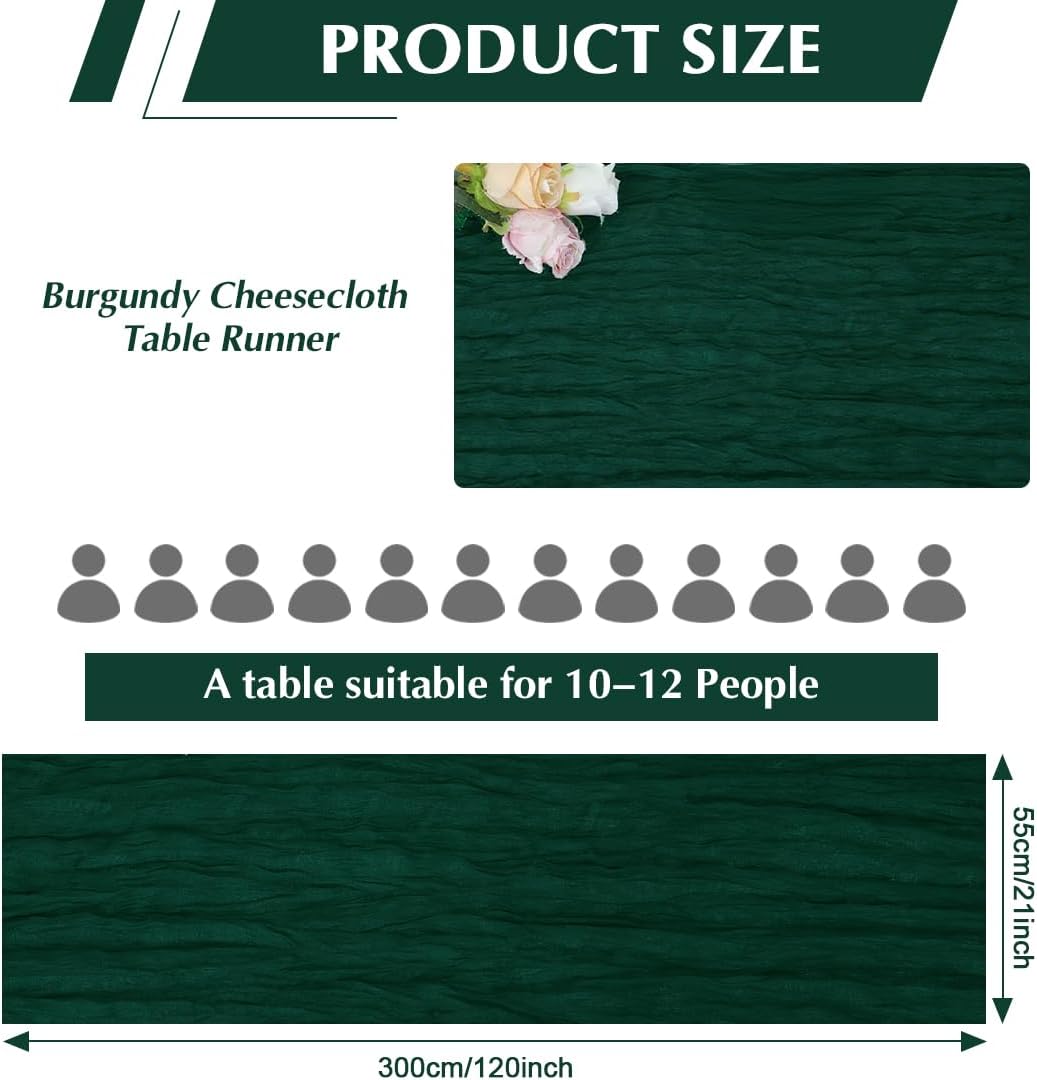10 Pack Blackish Green Cheesecloth Table Runner -21*120Inch Long Boho Wedding Table Decor, Rustic Gauze Fabric Runner for Bridal Showers, Baby Showers & Parties (Sheer, Lightweight, Wrinkled Design)