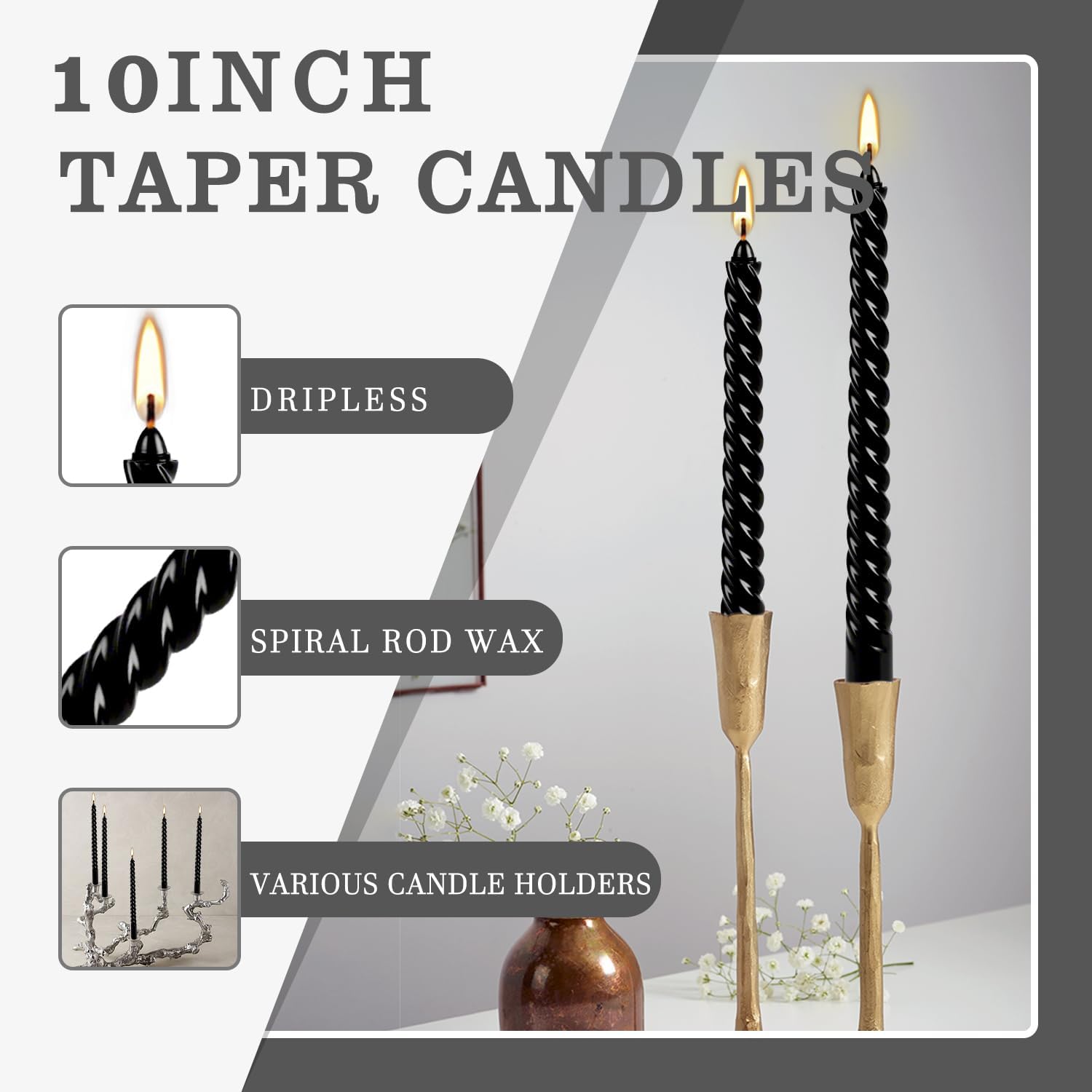 - Elegant Spiral Design & Black Aesthetic Features 12 black taper candles with a unique spiral shape, adding a touch of sophistication to any setting—ideal for dinners, weddings, or gothic-themed decor.