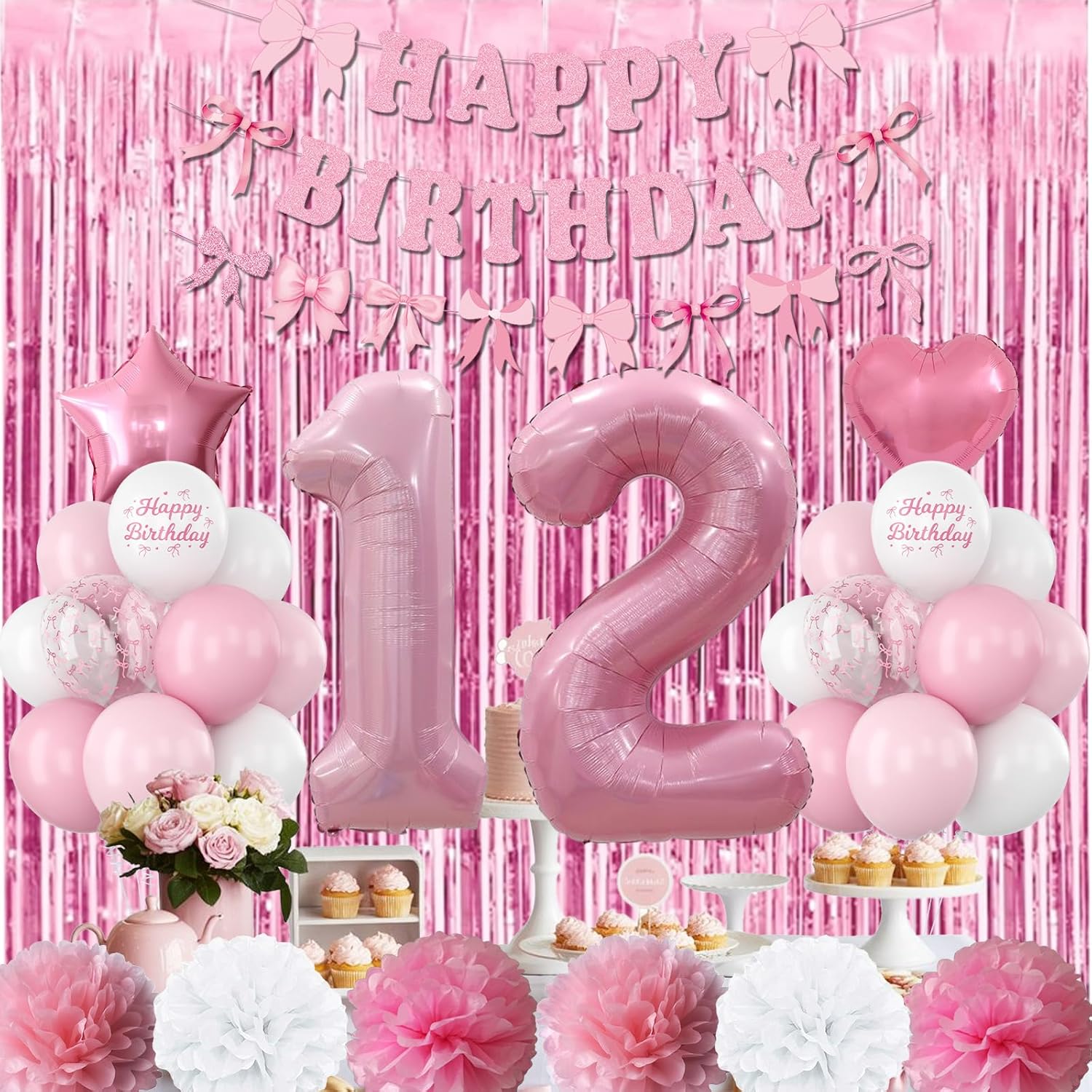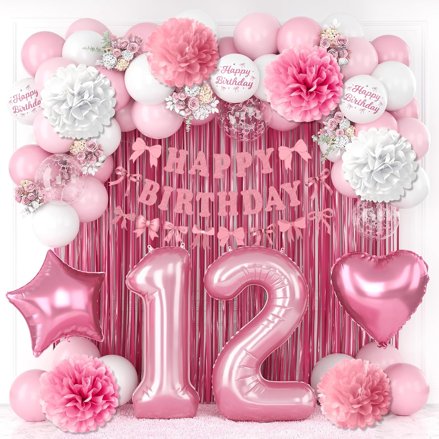 - PACKAGE INCLUDES: 1pc pearl pink number 12 balloon, 1pc bow happy birthday banner, 2pcs pink paper pom poms, 2pcs light pink paper pom poms, 2pcs white paper pom poms, 1pc pink curtain, 1pc light pink star foil balloons, 1pc light pink heart foil balloons,6pcs light pink balloons, 6pcs pastel pink balloons, 4pcs white balloons, 2pcs birthday printed balloons, 2pcs bow clear balloons, 1pc ribbon