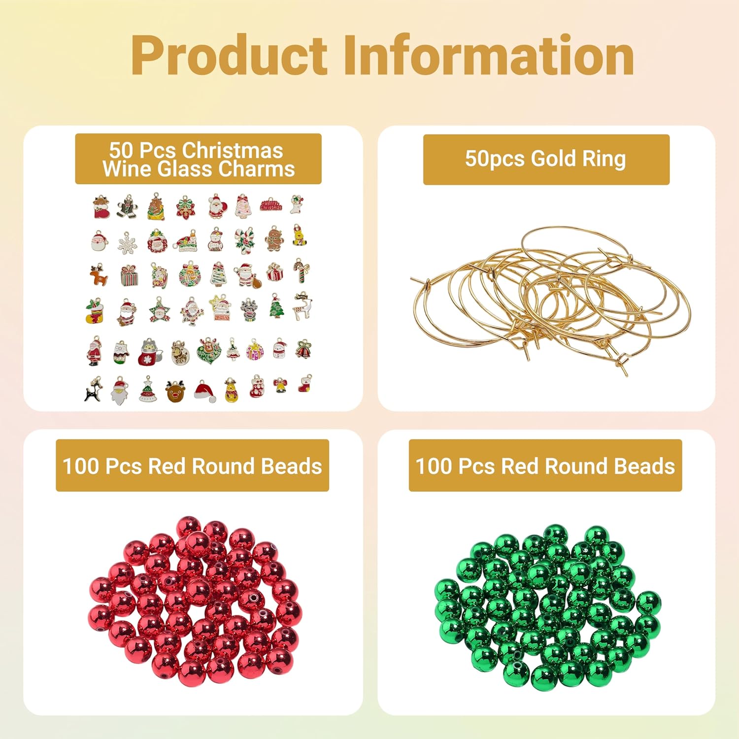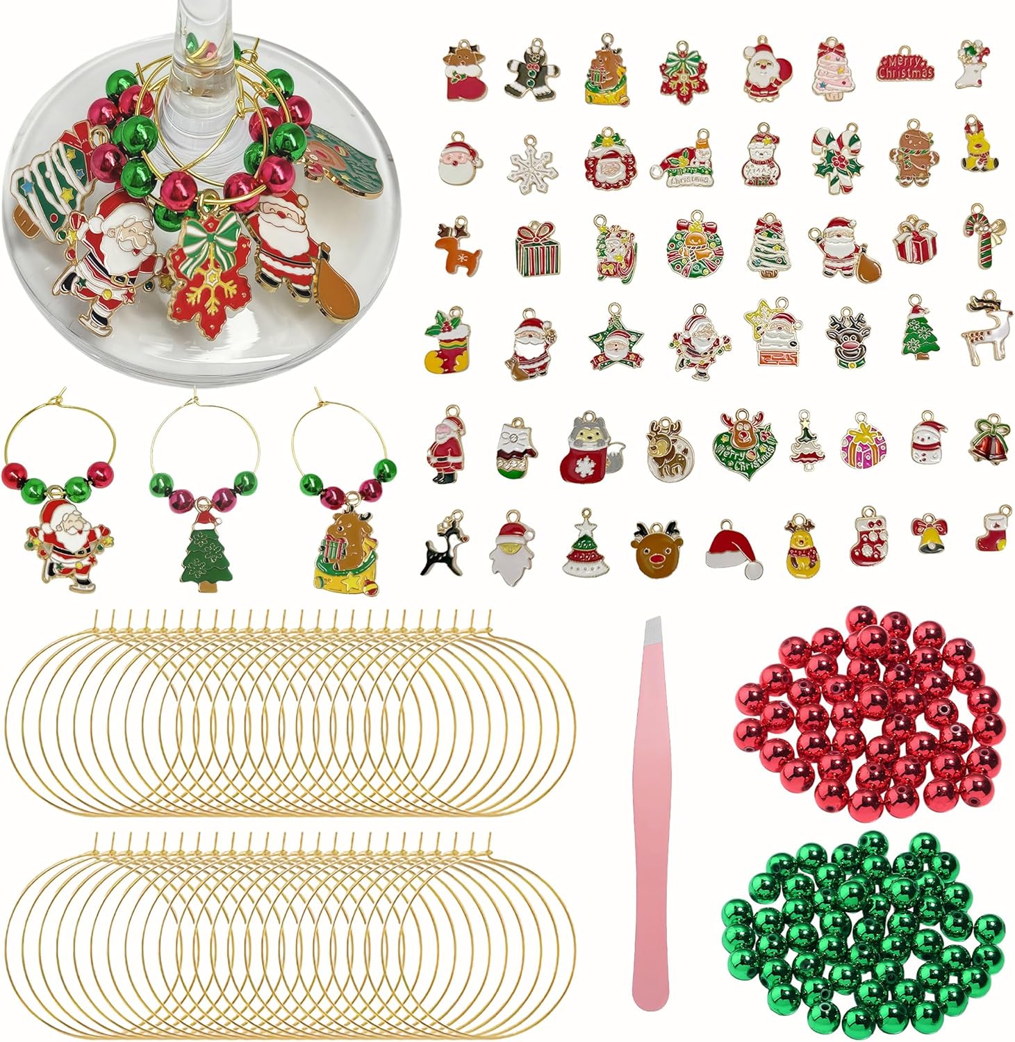 - CHRISTMAS WINE GLASS CHARMS KIT: Perfect for large holiday gatherings, this massive DIY kit ensures every guest's drink is beautifully identified! The set includes 50 elegant gold wine charm rings, 50 unique Christmas-themed alloy charms, 100 classic red beads, and 100 festive green beads, preventing any mix-ups during the festive chaos.