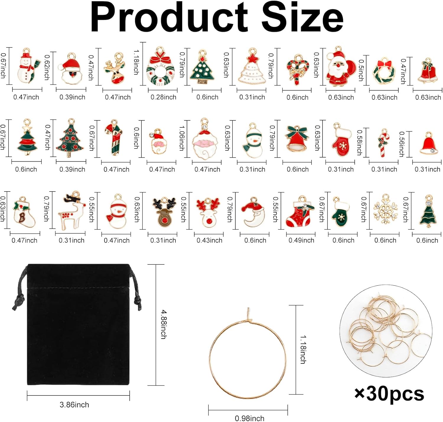 - Package Content: You will receive 30 pieces colourful Christmas themed charms and 1 storage bag. 30 wine glass charms of different patterns are combined with some classic elements of Christmas, such as Santa Claus, snowman, elk, Christmas tree, Christmas wreath, Christmas cane, glove, bell, Christmas stocking and so on. These cute wine glass tags are sure to bring more joy to your party time