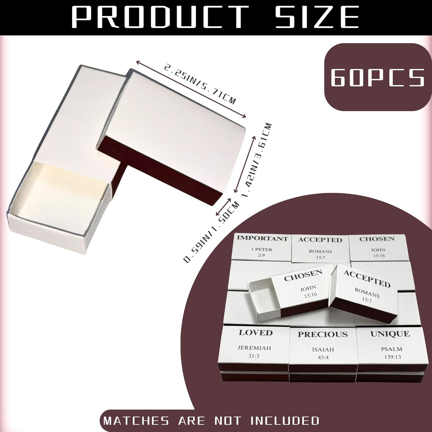 60pcs Blank Match Boxes, 2.25x1.42x0.59in Bulk Christian Bible Matchboxes DIY White Storage Containers Holders Double-Sided Striker Wedding Bridal Baby Shower Birthday Party Favor, No Matches Included